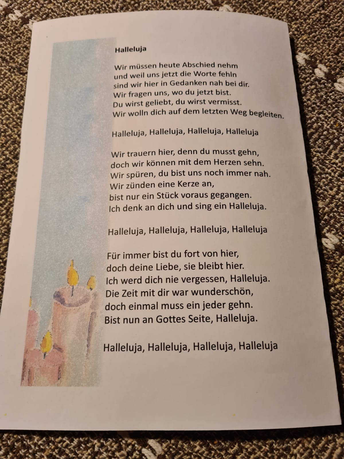 Es gab Beiträge aus den Begleitungen, es wurden Lieder gesungen – unter anderem „Weißt du, wieviel Sternlein stehen…“ – und auf jedem Sitzplatz lag ein Liedzettel mit einem Stern. Gemeinsam wurde der Verstorbenen gedacht. Wer mochte, konnte nach vorne gehen und eine Kerze entzünden.